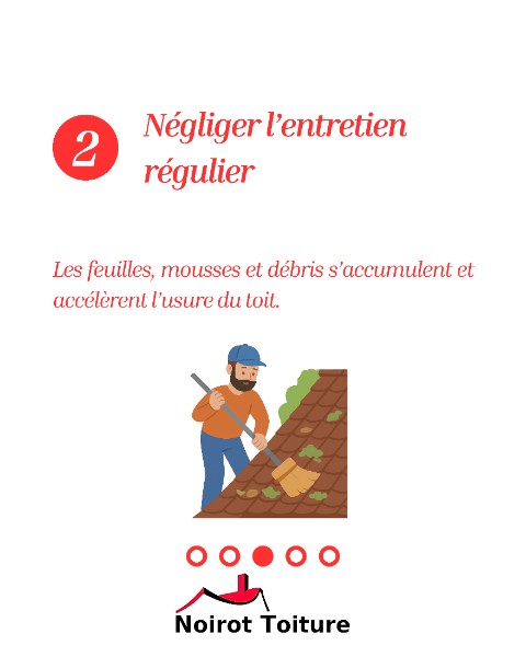 2. Négliger l'entretien régulier Les feuilles mortes, la mousse et les débris qui s'accumulent sur votre toit retiennent l'humidité et accélèrent l'usure de vos matériaux. Un nettoyage et un contrôle réguliers sont essentiels pour garantir la longévité de votre toiture.